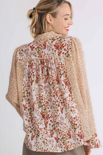 Umgee Full Size Mixed Print Metallic Detail Long Ruffle Sleeve Button Down Shirt Plus Size
