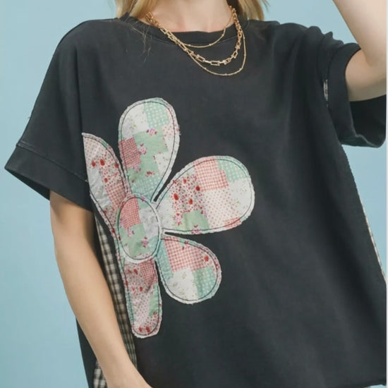 This T-shirt features a unique floral patchwork design, giving it a vintage and eye-catching appeal. The oversized fit ensures comfort and a relaxed silhouette. Made from a soft and breathable cotton blend, this T-shirt is perfect for everyday wear. The short sleeves and crew neck add to its casual style, making it easy to pair with jeans, shorts, or skirts. The durable construction ensures long-lasting wear, while the unique design sets it apart from ordinary T-shirts. Ideal for those who appreciate vintage-inspired fashion and comfortable clothing.