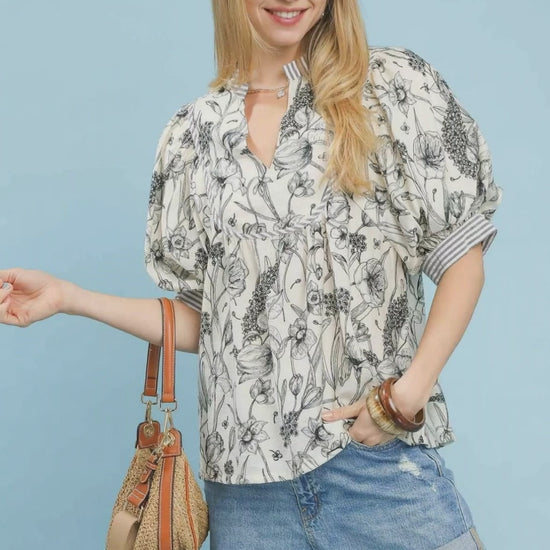 Umgee Mixed Print Puff Sleeve Split Neck Top